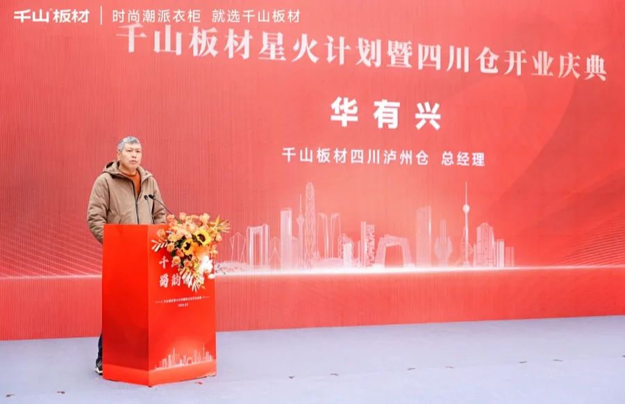 千山板材優(yōu)秀經(jīng)銷(xiāo)商代表,四川瀘州倉(cāng)總經(jīng)理華有興上臺(tái)致辭。華總分享到,在集團(tuán)總部和區(qū)域合作伙伴的支持與努力下,千山板材在瀘州地區(qū)的市場(chǎng)占有率逐年攀升,品牌影響力日益增強(qiáng)。未來(lái),將繼續(xù)加強(qiáng)合作,共同應(yīng)對(duì)市場(chǎng)挑戰(zhàn),實(shí)現(xiàn)互利共贏。