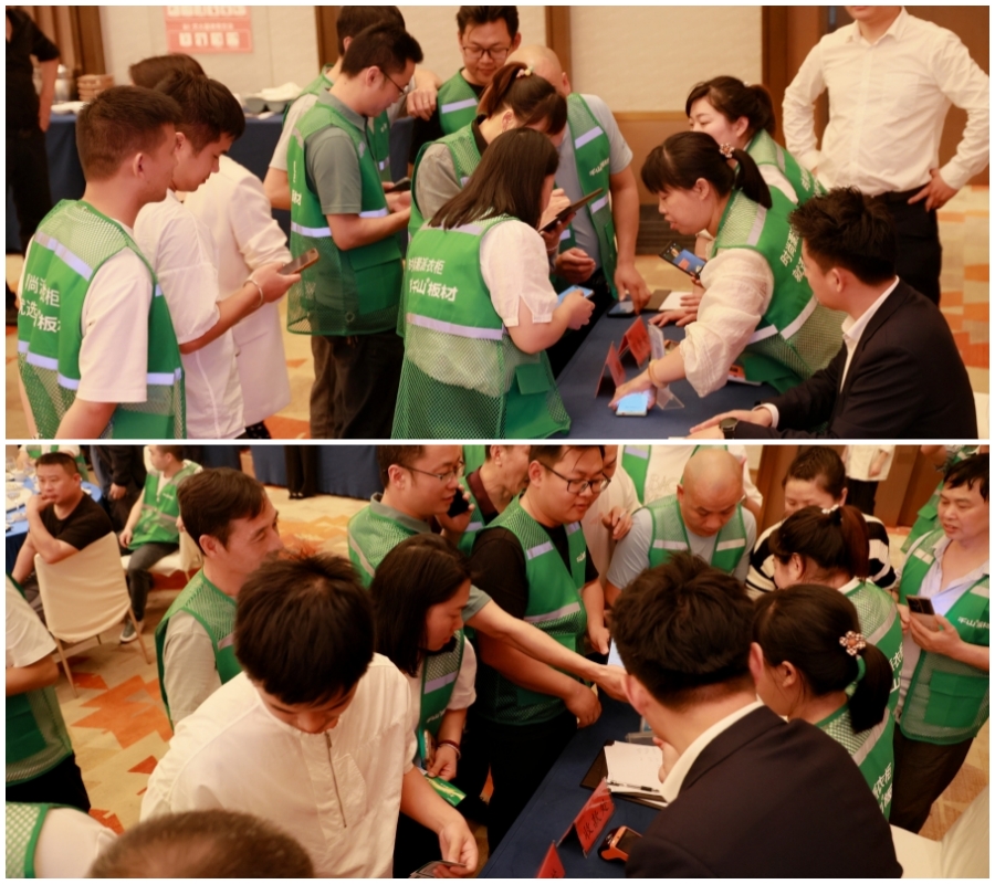 簽到結束后,大家仔細參觀了千山板材展示區的全品類產品,包括四大品類板材、新款樣冊、門墻柜一體化產品、配套輔材等。大家相互交流,分享產品應用心得。