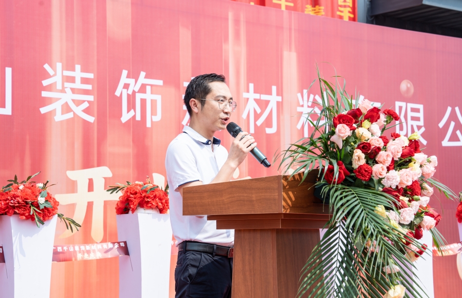 隨后,廣西千山裝飾新材料有限公司總經理邵廣峰發表講話。邵總表示,廣西生產基地將秉承集團的發展宗旨,在政府和協會的領導下,整合利用市場資源優勢,加強管理、提升技術,以高昂的熱情積極投身于各項生產經營活動,助力集團的高質量發展,同時為推動行業的發展作出應有的貢獻。