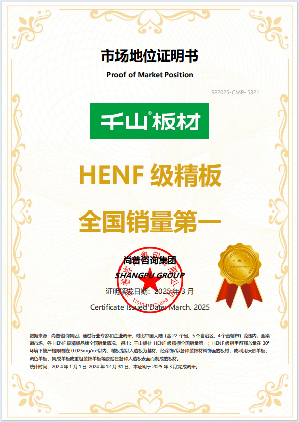 28年老牌板材大廠的深厚積淀,是千山高質(zhì)價(jià)比的堅(jiān)實(shí)后盾。作為中國(guó)板材國(guó)家品牌、HENF級(jí)精板全國(guó)銷量第一品牌,千山擁有全方位的品質(zhì)認(rèn)證體系——HENF級(jí)環(huán)保認(rèn)證、兒童安全認(rèn)證、近0氣味認(rèn)證,自主研發(fā)的凈醛、抗菌、抗病毒技術(shù)均獲得權(quán)威檢測(cè)報(bào)告支持。依托成熟的國(guó)產(chǎn)智能化供應(yīng)鏈,我們實(shí)現(xiàn)產(chǎn)能穩(wěn)定、品控嚴(yán)格、成本可控的三重保障,讓高端品質(zhì)板材以親民價(jià)格落地,真正做到“好板不貴、品質(zhì)可鑒”。