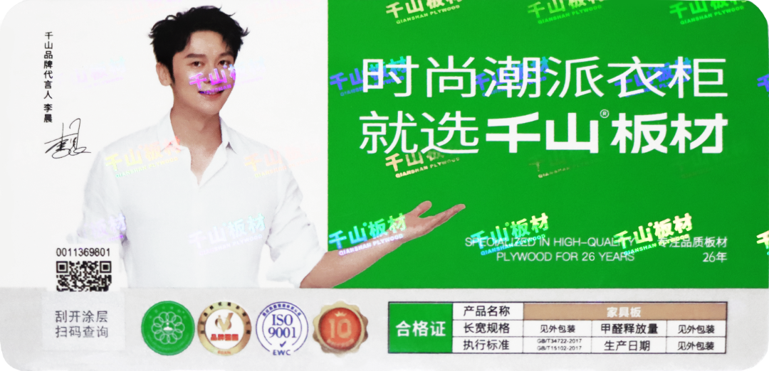 防偽商標(biāo)表面測(cè)光可見(jiàn)“千山板材”亮色水印。