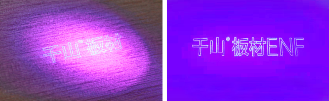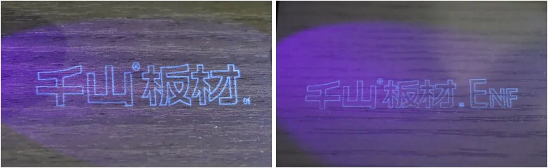 千山板材每張板材表面都印有隱形防偽標(biāo)識(shí),使用紫光手電筒照射板材表面,顯現(xiàn)“千山板材” 或 “千山板材ENF”。