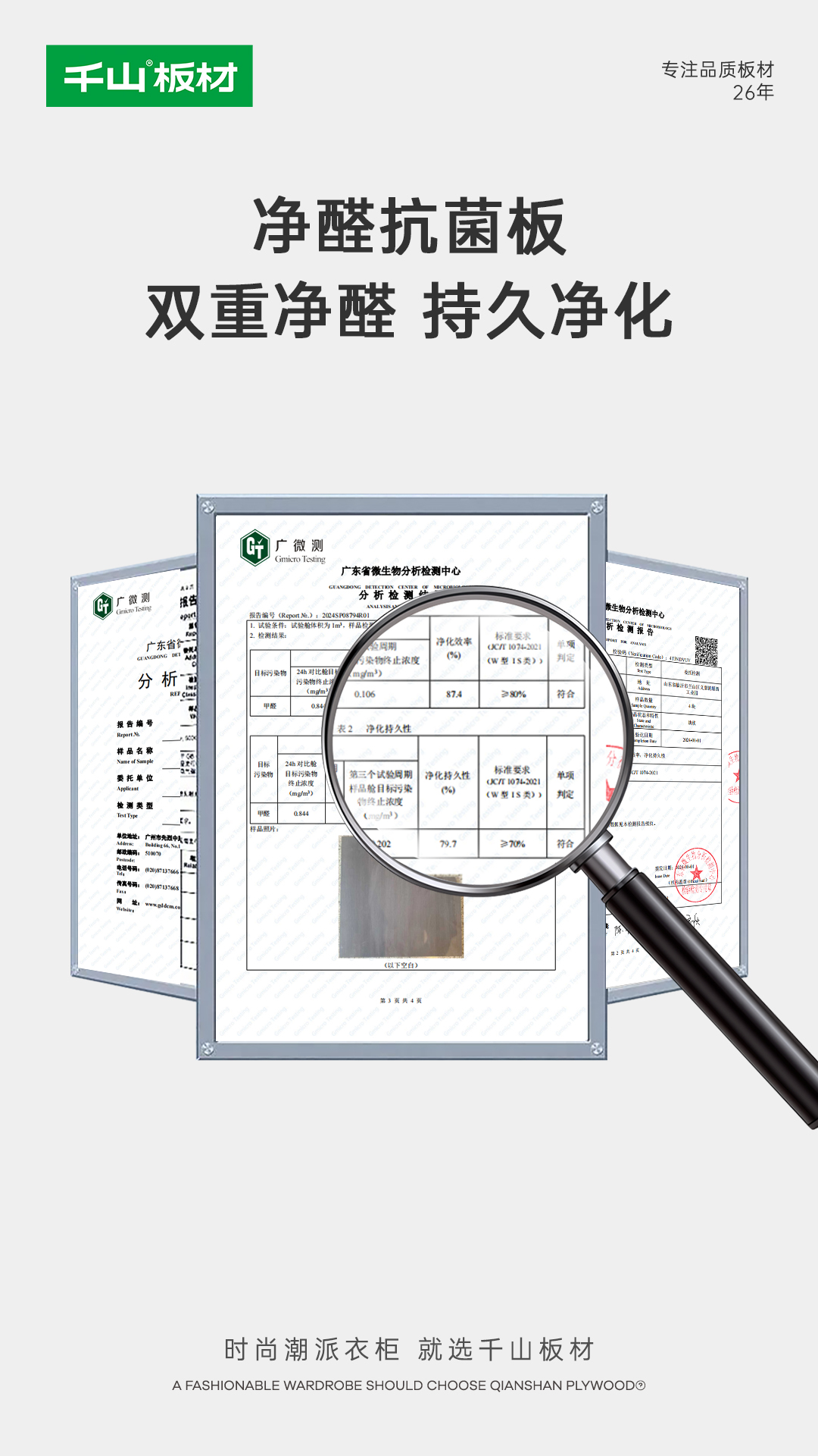 千山板材凈醛抗菌板產品帶有“凈醛板”防偽標識,紫光燈下顯示“凈醛 抗菌 抗病毒”防偽水印,歡迎親臨當地千山板材品牌專賣店先睹為快。