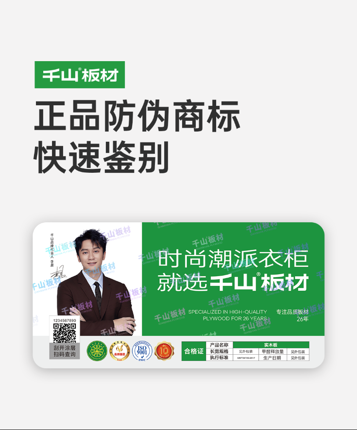 正品千山板材均有可鑒別、可查詢的防偽商標及防偽編碼,刮開二維碼涂層,微信掃描二維碼,即可查詢驗證。同時,防偽商標表面測光可見“千山板材”亮色水印。