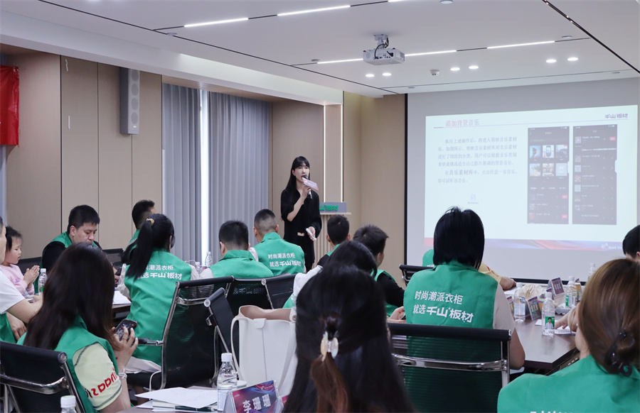 千山板材河南運營中心總經(jīng)理程效章致辭。程總表示,短視頻和直播已成為搶占市場的核心賽道,抖音也將是經(jīng)銷商伙伴們開拓新市場的“超級武器”,希望伙伴們通過此次賦能特訓(xùn)掌握短視頻的營銷密鑰,在家居藍海中共贏未來!