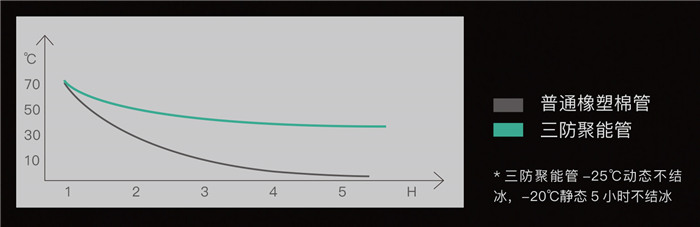 保溫層采用新型 PE 閉孔發(fā)泡材料,導(dǎo)熱系數(shù)低至0.028W/ (m-K),在低溫環(huán)境下,可有效減少熱損失,延長(zhǎng)熱水冷卻時(shí)間;