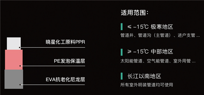 管材采用曉星原料顆粒,質(zhì)量可靠。外護(hù)層采用自主研發(fā) EVA 抗老化尼龍層,耐候抗刮擦抗老化,有效保護(hù)保溫層及內(nèi)管。